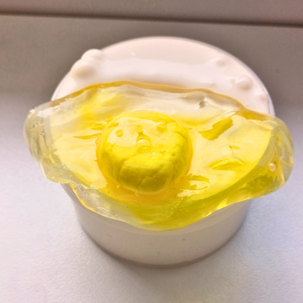1x egg mini clay piece covered in clear slime (will come in a deli container)